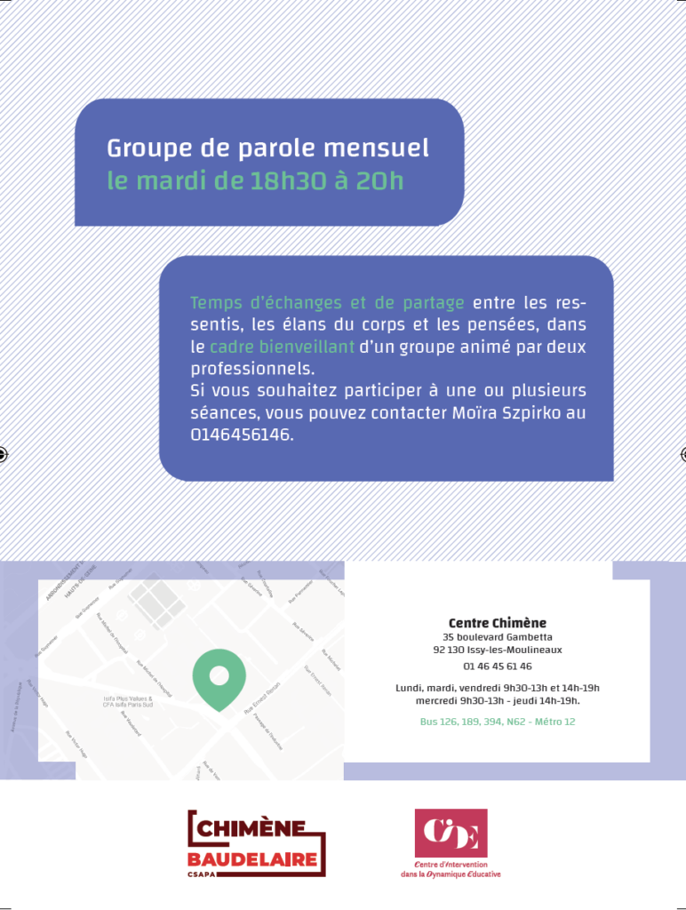 En abordant des situations concrètes ou des préoccupations qui engagent la place des parents, cet espace de rencontre animé par deux psychologues, permet de partager des expériences, de mettre en commun des réflexions et interrogations afin de créer une nouvelle dynamique de parole avec leurs enfants. Le groupe a lieu sur le site de Chimène en lien étroit avec le site de Baudelaire.